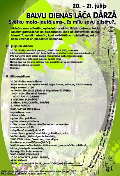Trešās jūlija nedēļas nogalē Balvu pilsētas populārākā tūrisma apskates objekta-,,Lāča dārzs,, klusumu un mieru satricinās jaudīga un neatkārtojama gaisotne, vērienīgs pasākums - Balvu pilsētas svētki ,,Es mīlu savu pilsētu?", kas pulcinās plašu interesentu loku uz daudzveidīgu un atraktīvu aktivitāšu programmu.