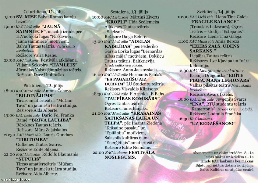 23.00 Balvu Kultūras un atpūtas centra laukums. Festivāla atklāšana. Jūrmalas Valsts ģimnāzijas teātris Viljams Šekspīrs ,,Hamlets” . Režisore Dace Umbraško