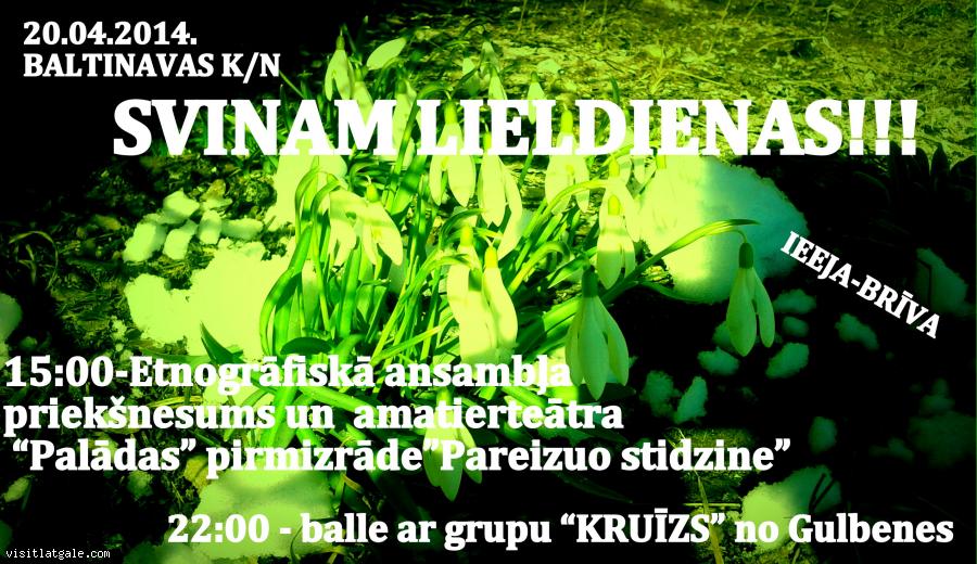 20.04.2014., plkst. 15:00 – Svinam Lieldienas Baltinavas kultūras namā: Baltinavas novada etnogrāfiskā ansambļa priekšnesums un Baltinavas novada dramatiskās kopas „Palādas” pirmizrāde „Pareizuo stidzine”.