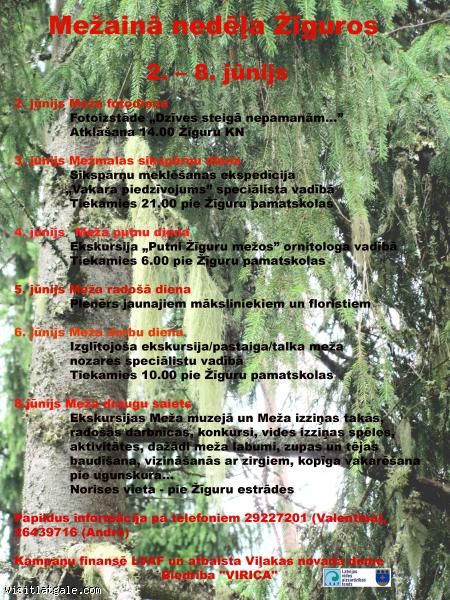 Kampaņas„Mežainā nedēļa Žīguros” pasākumi norisināsies no 2. līdz 8. jūnijam. Visas aktivitātes vērstas uz dabas, īpaši – meža – izzināšanu caur saistošām ekskursijām, radošu darbošanos, izzinošām un attīstošām spēlēm, konkursiem. Galvenā doma – atbildīgi varam būt par to, ko pazīstam, izjūtam, izprotam.