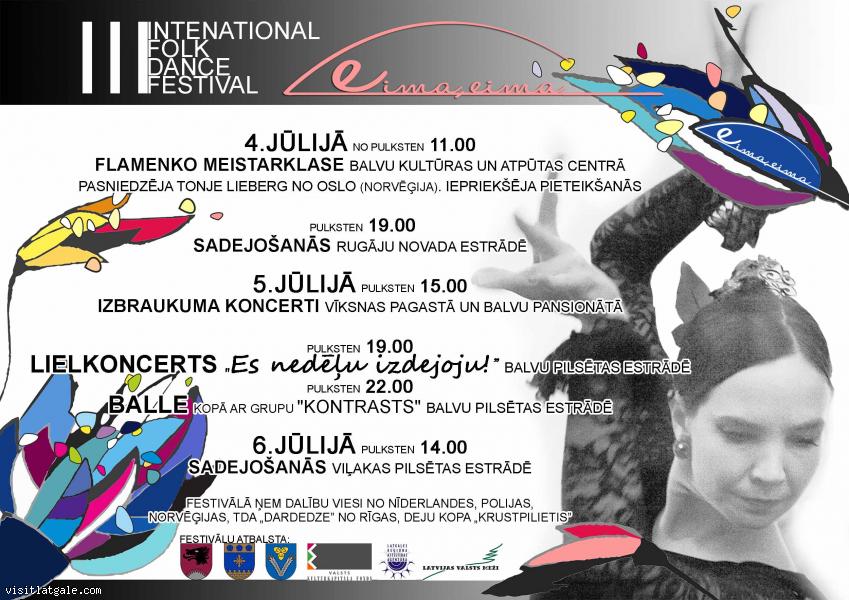 No 4. līdz 6.jūlijam Balvos jau trešo reizi notiks Starptautiskais tautu deju festivāls „Eima, eima!”, kurā piedalās deju kolektīvi no Balvu, Baltinavas, Viļakas, Rugāju novadiem, viesi no Nīderlandes, Norvēģijas, Baltkrievijas, Polijas, Rīgas VEF TDA „Dardedze” un senioru deju kopa ,,Krustpilietis” no Jēkabpils.