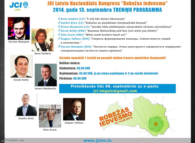 Nacionālais Kongress “Robežas iedvesmo”. Tā ietvaros Daugavpilī viesosies 7 Latvijā un pasaulē zināmi treneri, kuri 13.09.2014. visas dienas garumā piedāvā intensīvu treniņu programmu, kuru aicinām apmeklēt arī studentus, uzņēmējus, uzņēmumu un organizāciju darbiniekus un citus interesentus. Apmācības norisināsies no plkst. 10:30 līdz 16:00 paralēli 3 valodās (latviešu, krievu un angļu valodās) 3 sesijās.