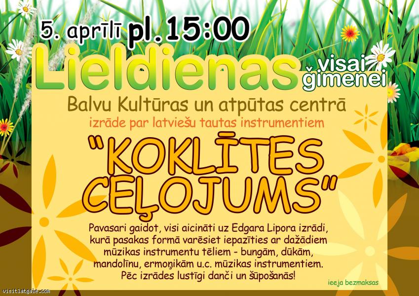 5. aprīlī 15:00 Lieldienas visai ģimenei Balvu Kultūras un atpūtas centrā - izrāde par latviešu tautas instrumentiem "Koklītes ceļojums". Pēc izrādes lustīgi danči un šūpošanās. Ieeja bezmaksas.