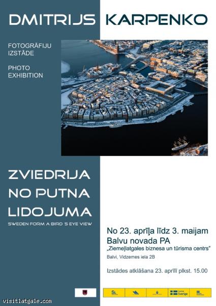 Plkst.15:00 Izstādes „Zviedrija no Putna lidojuma” atklāšana, Vidzemes iela 2B. Šajā izstādē Zviedru/Krievu izcelsmes fotogrāfs Dmitrijs Karpenko prezentē 50 iespaidīgas fotogrāfijas, kas ir uzņemtas Stokholmā un Malaren ezera tuvumā. Bildes viņš uzņēma no pašam piederošā Cessna lidaparāta.
