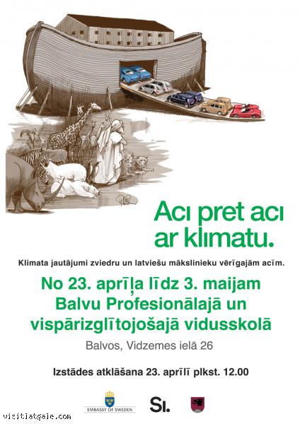 Plkst. 12:00 Izstādes „Klimata pārmaiņas” atklāšana Balvu Profesionālajā un vispārizglītojošajā vidusskolā, Vidzemes iela 26. Izstādes ietvaros Zviedrijas un Latvijas animatori piedāvā gan izklaidējošus, gan brīdinošus zīmējumus par klimata pārmaiņām. Satīrs un humors tiek miksēts, lai uzsvērtu nepieciešamību nopietnāka attiekties pret klimata pārmaiņu jautājumu.