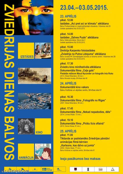 Plkst.17:30 Zviedru filmu festivāla atklāšana Balvos, rādot dokumentālo filmu „Ceļa gals” Balvu Novada muzejā, Brīvības ielā 46. Filmas režisore ir Mauda Nikadera, kas filmē sievieti vārdā Daina, kura dzīvo Latgalē. Daina dzīvo 3km attālumā no tuvākā ceļa, bez elektrības vai tekoša ūdens. Dainai ir divi pieauguši bērni, abi ir imigrējuši uz Eiropas valstīm. Daina ir pilnīgi atkarīga no sevis, lai nodrošinātu savu izdzīvošanu.