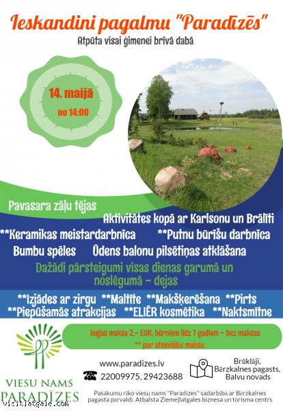 14. maijā tuvāki un tālāki ciemiņi tiek aicināti uz viesu namu “Paradīzes” Balvu novada Bērzkalnes pagasta Brūklājos, kur saimnieki Normunds un Sanita Prūši sadarbībā ar Bērzkalnes pagasta pārvaldi rīko pasākumu visai ģimenei “Ieskandini pagalmu “Paradīzēs””.