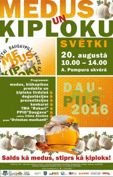 Daugavpilī, Andreja Pumpura skvērā, 20.augustā plkst. 10: 00 – 14:00 Latviešu kultūras centrs, Latvijas biškopības biedrības Daugavpils nodaļa un ķiploku audzētāji pirmo reizi aicina apmeklēt Medus un ķiploku svētkus un saņemt veselības eleksīra devu pasākumā “Salds kā medus, stiprs kā ķiploks”.
