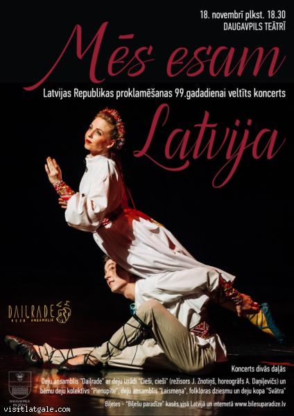 18. novembrī plkst. 18.30 Daugavpils teātrī notiks Latvijas Republikas proklamēšanas 99. gadadienai veltīts koncerts „MĒS esam LATVIJA”, kurā piedalīsies deju ansamblis „Daiļrade” kopā ar Daugavpils pilsētas kolektīviem: deju ansambli „Laismeņa”, bērnu deju kolektīvu „Pienupīte” un folkloras dziesmu un deju kopu „Svātra”.
