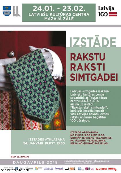 Latvijas simtgades ieskaņā Daugavpils Latviešu kultūras centrs sadarbībā ar Tautas tērpu centru “SENĀ KLĒTS” aicina uz izstādi “Rakstu raksti simtgadei”, kurā būs iespēja iepazīt visu Latvijas novadu cimdu rakstu un krāsu bagātību 100 dūraiņos. Cimdi no Latgales, Vidzemes, Augšzemes, Zemgales un Kurzemes novadiem darināti pēc Latvijas Nacionālā vēstures muzeja, Liepājas muzeja un Latvijas Etnogrāfiskā brīvdabas muzeja cimdu krājuma.