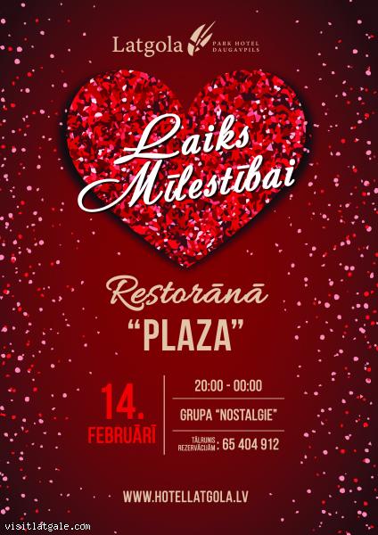 14. februārī no plkst. 20.00 līdz plkst. 00.00 restorānā “Plaza” notiks Valentīndienai veltīta programma “Laiks mīlestībai”. Romantiskā vakara laikā skanēs dzīvā mūzika un dziesmas tikai par un ap mīlestību kopā ar grupu Nostalgie.