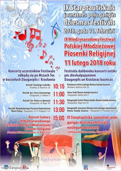11.februārī Daugavpilī notiks IX Starptautiskais jaunatnes poļu garīgās dziesmas festivāls, kuru kopš 2004. gada organizē Poļu kultūras centrs. Festivāls tradicionāli notiek vienu reizi divos gados, un tā dalībnieki ir vokālie kolektīvi, ansambļi un solisti no Polijas un Lietuvas, kā arī no Rēzeknes, Krāslavas un Daugavpils poļu skolām.
