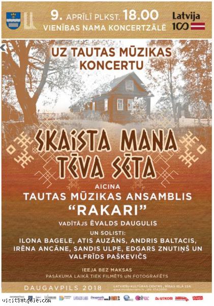 9. aprīlī plkst. 18.00 Vienības nama koncertzālē notiks tautas mūzikas koncerts “Skaista mana tēva sēta”, kurā uzstāsies tautas mūzikas ansamblis “Rakari” kopā ar saviem draugiem un bijušajiem solistiem: Ilonu Bageli, Ati Auzānu, Andri Baltaci, Irēnu Ancāni, Sandi Ulpi, Edgaru Znutiņu un Valfrīdu Paškeviču.
