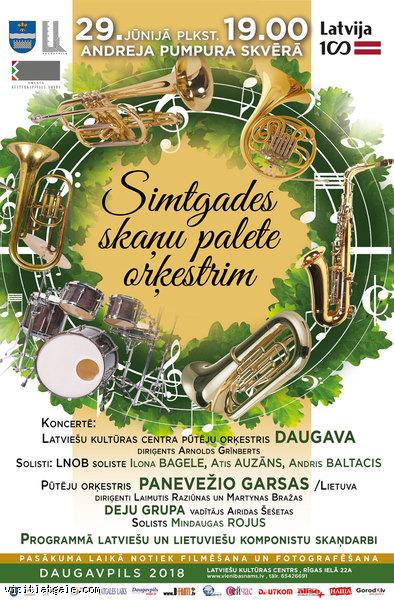 Pēterdienā, 29. jūnijā, plkst. 19.00, Daugavpilī, Andreja Pumpura skvērā notiks koncertu cikla “Simtgades skaņu palete orķestrim” pirmais koncerts, kurā Daugavpils Latviešu kultūras centra profesionālais pūšamo instrumentu orķestris “Daugava” (diriģents Arnolds Grīnberts,), ”Panevežio Garsas” (Lietuva, diriģenti Laimutis Raziūnas un Martynas Bražas), solists Mindaugas Rojus un deju grupa (vadītājs Airidas Šešetas) aicinās klausītājus izbaudīt Latvijas un Lietuvas komponistu skaņdarbus pūtēju orķestru sniegumā, kopā cildinot abu valstu simtgadi. Koncerta solisti: Latvijas Nacionālās Operas un baleta soliste Ilona Bagele, dziedātāji Atis Auzāns un Andris Baltacis.