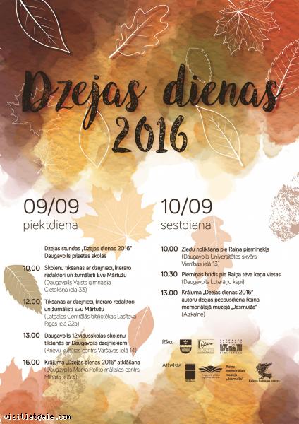 Dzejas dienu pasākumi turpināsies sestdien, 10.septembrī. Plkst. 10:00 būs ziedu nolikšana pie Raiņa pieminekļa Daugavpils Universitātes skvērā, plkst. 10:30 – piemiņas brīdis pie Raiņa tēva kapa vietas Daugavpils Luterāņu kapos, bet plkst. 13:00 notiks krājuma „Dzejas dienas 2016” autoru dzejas pēcpusdiena Raiņa memoriālajā muzejā „Jasmuiža”.