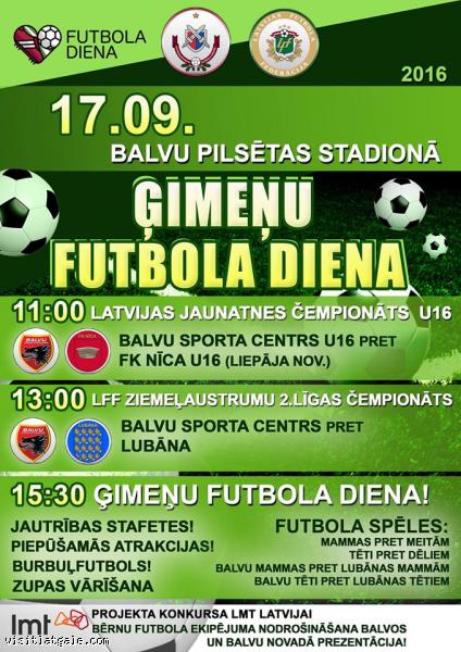 15.30 paredzēta ģimeņu futbola dienas atklāšana, kam sekos dažādas stafetes, burbuļfutbols, futbola spēles stap tēviem un dēliem, mammām un meitām. Šajā pasākumā piedalīsies ne tikai Balvu, bet arī viesi no Lubānas.