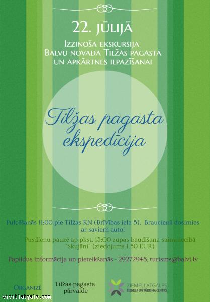 Šī gada 22. jūlijā – Tilžas pagasta svētku dienā aicinām doties braucienā “Tilžas pagasta ekspedīcija”. Pasākums tiek organizēts kā izzinoša ekskursija, kurā dalībnieki brauc ar savām automašīnām. Dienas laikā tiks apmeklētas interesantas vietas, kas atklās Balvu novada Tilžas pagasta un apkārtnes vēsturi, dabu un ļaus iepazīt čaklos pagasta cilvēkus. Vietējā gida lomā - tilženiete Aina Rakstiņa.