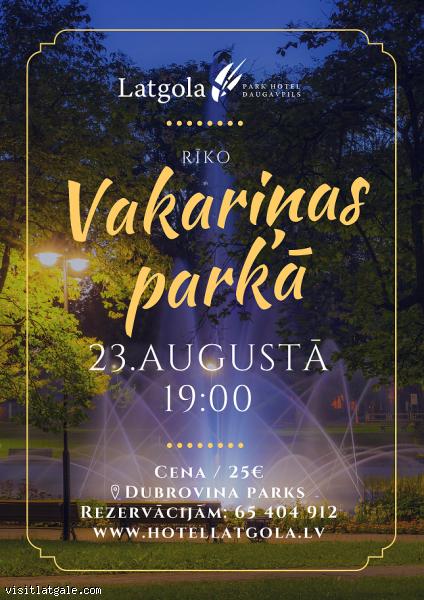 Daugavpilī, 23.augustā, plkst. 19:00, viesnīcas “Park hotel Latgola” restorāns “PLAZA” aicina uz vakariņām Dubrovina parkā, kuru laikā būs iespēja piedzīvot garšas, dabas un mūzikas sintēzi. Vakariņas parkā dos iespēju izbaudīt oriģinālu ēdienkarti, ko īpaši šim pasākumam ir sastādījis jaunais, talantīgais pavārs Haralds Saušs, un varenās strūklakas ūdens spēles saulrieta laikā. Par mūziku džeza skaņās rūpēsies Inna un Vadims Kraliki. Uz vienu vakaru parks pārvērtīsies skaisti klātā restorānā ar gaismas virtenēm, svecēm un baltiem galdautiem.