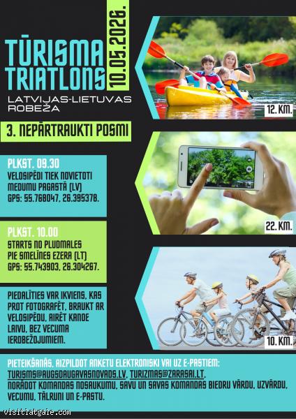Bet tieši šogad Tūrisma triatlons sāksies 10. maijā Laucesas upē uz Latvijas – Lietuvas robežas. Tālāk maršruts norisināsies īpaši aizsargājamo ainavu apvidus “Augšzeme” skaistākajās vietās. Šoreiz laivošana notiks Laucesas upes posmā Latvijas – Lietuvas robežā, jo triatlons tiks organizēts sadarbībā ar Zarasu rajona tūrisma informācijas centru, un, ņemot vērā izveidojušos apstākļus, pasākums izies starptautiskā līmenī.
