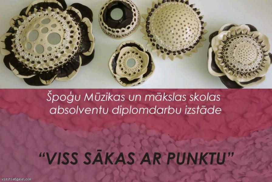 Izstāde “Viss sākas ar punktu” piedāvā daudzveidīgus mākslas darbus, kur jauno mākslinieku dažādās domas, izjūtas un noskaņas ir izteiktas ar formu, līniju vai krāsaino laukumu palīdzību. Savos diplomdarbos skolēni ir radījuši neparastas formas interjera objektus, iemūžinājuši skaisto Latvijas dabu, vai arī maketā attēlojuši savu nākotnes atpūtas namiņu. Darbi ir izpildīti dažādās tehnikās – gleznoti ar eļļas krāsām, zīmēti uz stikla, austi, veidoti no gāzbetona, šamota un citiem materiāliem.