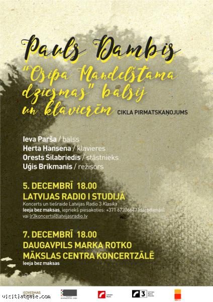 7. decembrī, plkst. 18.00, Daugavpils Marka Rotko mākslas centra koncertzālē Ieva Parša un Herta Hansena pirmatskaņos Paula Dambja ciklu “Osipa Mandelštama dziesmas” balsij un klavierēm.