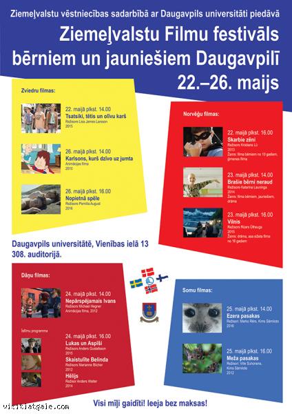 Mācību gada noslēgumā no 22. līdz 26.maijam Ziemeļvalstu vēstniecības Latvijā aicina bērnus un jauniešus uz Ziemeļvalstu filmu festivālu Daugavpilī. Filmas tiks demonstrētas Daugavpils Universitātē, 308. auditorijā, Vienības ielā 13, Daugavpilī. Ieeja uz visiem seansiem bez maksas.
