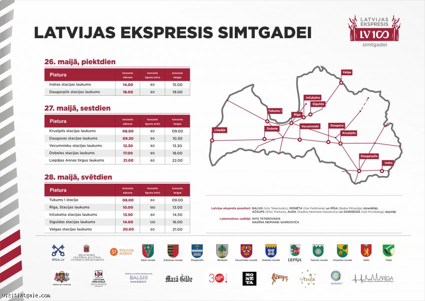 No 26. – 28. maijam cauri visiem Latvijas vēsturiskajiem novadiem ceļā dosies speciāls vilciena reiss Latvijas ekspresis simtgadei ar vairāk kā 180 pasažieriem – dziedātājiem un dejotājiem. Gaidot XXVI Vispārējos latviešu Dziesmu un XVI Deju svētkus un Latvijas simtgadi, īpašais vilciens piestās 12 Latvijas vietās un dzelzceļa staciju laukumos, kopā ar koriem BALSIS, Monēta un Rīga, deju ansambļiem Ačkups, Auda, Dardedze un vietējiem māksliniekiem, trijās dienās sniegs 12 unikālus bezmaksas koncertus.