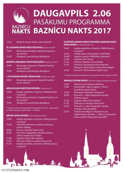 Piektdien, 2. jūnijā, Daugavpilī un citviet Latvijā, norisināsies kultūras notikums “Baznīcu nakts”. “Baznīcu nakts” kļuvusi par ikgadēju garīgās kultūras notikumu, kas notiek jau ceturto gadu. Laikā no 18:00 līdz pusnaktij durvis pasākumam vērs vaļā 190 dievnamu Latvijā. Visi dievnami atrodami www.baznicunakts.lv interaktīvajā kartē.