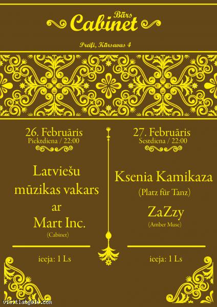 Sestdien, 27.februārī - raidījuma „Intelligent Beats” un leibla „Platz für Tanz” vadītāja KSENIA KAMIKAZA viesosies bārā "Cabinet". Ksenijas muzikālais sniegums neatstās vienaldzīgu pat viskūtrāko dejotāju, tāpēc ir vērts sastapt Kseniju uz skatuves! Mēs viņu uzskatām par labāko! Warm up setu nodrošinās ZaZzy.